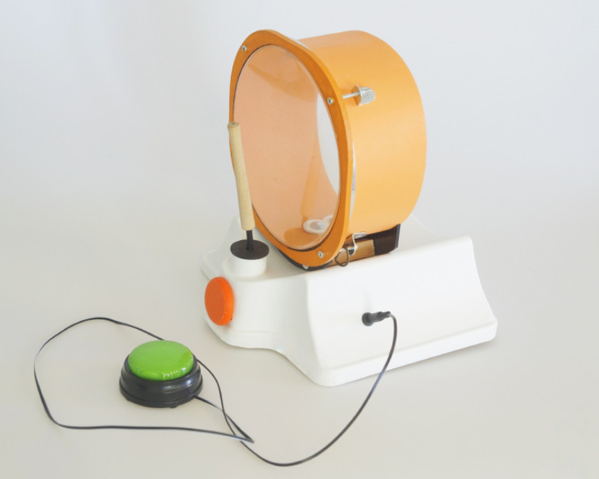 Барабан – это электро-механическое устройство с подвижной частью, предназначенное для занятий с детьми, позволяющее развивать слухоречевой аппарат. Состоит из основы, закрепленного на ней барабана, вращающейся барабанной палочки, кнопки активации электромотора, а также разъем 3,5 мм. Для подключения дополнительного девайса. На нижней части имеется батарейный отсек для четырех элементов питания. Барабан можно активировать при помощи стационарной кнопки расположенной на корпусе устройства, так и подключив через разъем дополнительную выносную кнопку активации. Занятия можно проводить как с одним ребенком, так и с группой детей под руководством педагога.