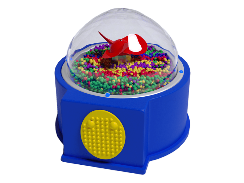 Нажмите на желтый тактильный переключатель. Внутри купола начнут кружиться и мерцать разноцветные блестки. Одновременно с этим будут мигать разноцветные лампочки и играть музыка. Можно также использовать при игре внешний переключатель.