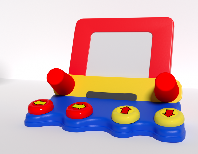 Игра «Создай рисунок» разработана для детей с особенностями физического развития, которые в силу ограниченных возможностей функционирования конечностей не могут рисовать при помощи обычных карандашей, красок или фломастеров. Устройство в пластиковом корпусе оборудовано съёмным экраном и четырьмя кнопками с условными обозначениями направлений. Изготовлено из высококачественного ударопрочного пластика, имеет обтекаемые плавные формы без острых краёв и углов.
