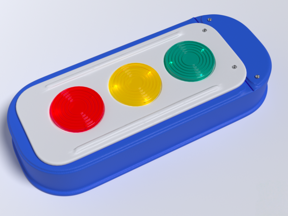 Игра «Светофор» предназначена для детского общего развития и развития детей, имеющих проблемы со слуховым, зрительным и слуховым восприятием информации, коммуникацией. Представляет собой прямоугольный корпус, на котором размещены 3 текстурированные кнопки – красная, желтая и зеленая. Изготовлено из высококачественного ударопрочного пластика, имеет обтекаемые плавные формы без острых краёв и углов. При нажатии на красную кнопку – сработает сигнал автомобильного гудка. При нажатии на желтую кнопку – устройство завибрирует. При нажатии на зелёную кнопку – заиграет приятная музыка.