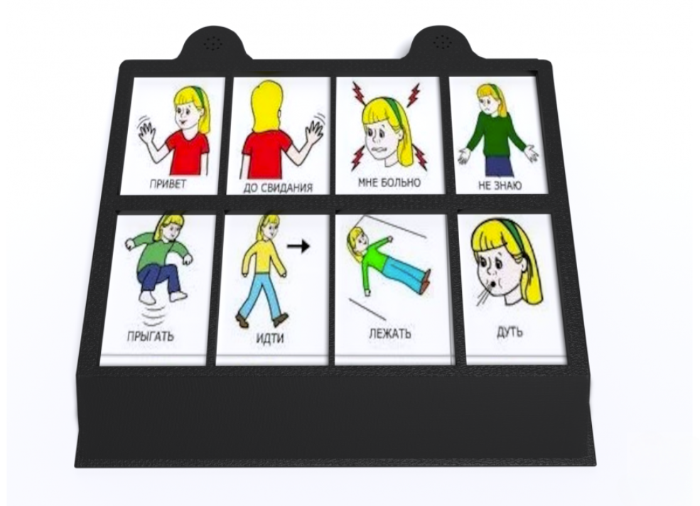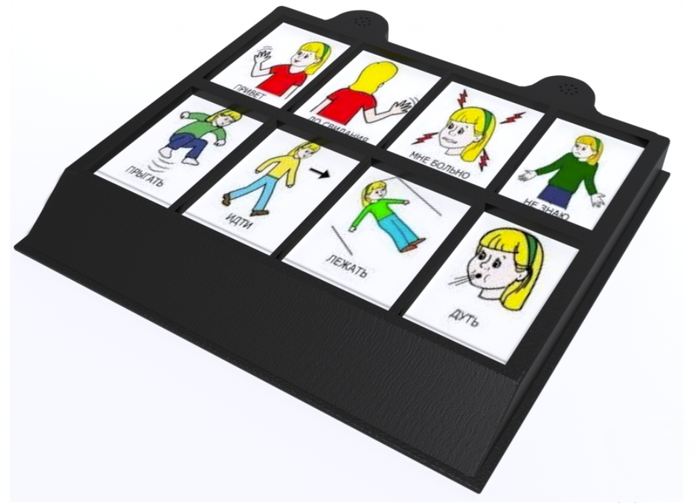 8 кнопочный игровой коммуникатор имеет 12 уровней воспроизведения сообщений; предназначен для развития и реабилитации детей, имеющих проблемы со слуховым, тактильным, зрительным восприятием и коммуникацией (ДЦП, аутизм, СДВГ и т.д.). Представляет собой слегка возвышенный сзади прямоугольный корпус, на котором размещены 8 кнопок с изображением и подписью определённого действия или слова – «Привет», «До свидания», «Мне больно», «Не знаю», «Прыгать», «Идти», «Лежать», «Дуть». Изготовлено из высококачественного ударопрочного пластика, имеет обтекаемые плавные формы без острых краёв и углов.