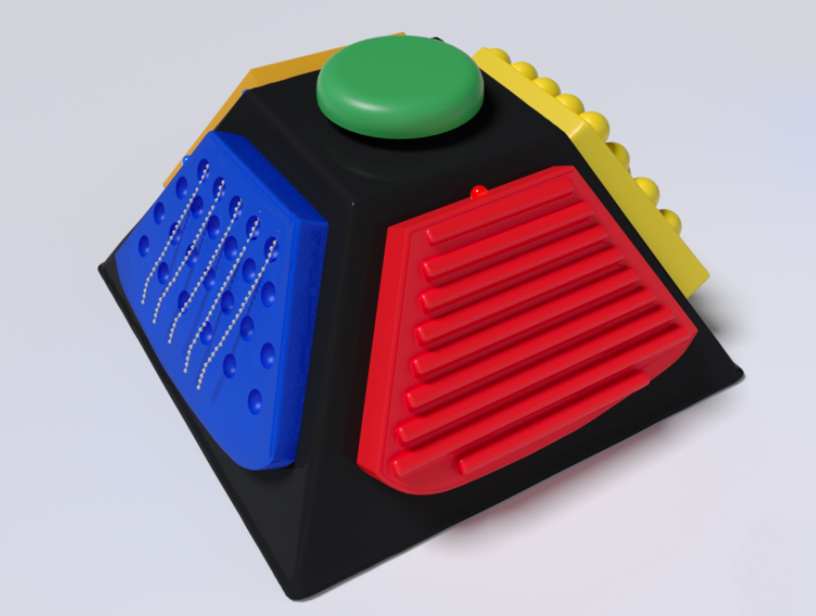 Представленный настольный развивающий центр предназначен для развития детей с ОВЗ. Представляет собой пирамиду, на вершине которой расположена кнопка; на каждой грани пирамиды имеются кнопки с разной текстурой, различающиеся по цвету, на одной из кнопок - встроенные цепочки из бусинок. Вокруг кнопок встроены разноцветные светодиодные огоньки. Изготовлено из высококачественного ударопрочного пластика, имеет обтекаемые плавные формы без острых краёв и углов.