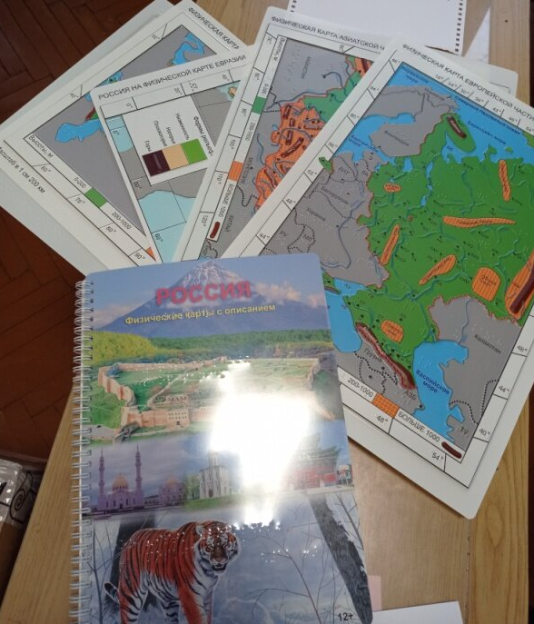 Пособие представляет собой набор из четырех физических рельефно-графических карт и одной контурной карты России, а также альбома с их описанием. Информация в картах и альбоме представлена плоскопечатным шрифтом и шрифтом брайля.