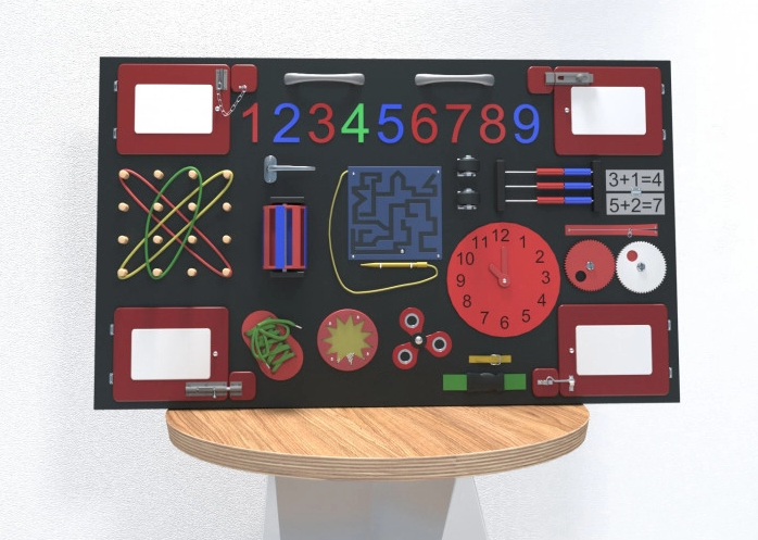 Бизипанель – это «гибрид» настенной игровой панели и бизиборда. Она больше, обычный компактный бизиборд и более функциональна, чем стандартная настенная игровая панель, так как оснащена большим количеством игровых приспособлений. Представленная модель выполнена в чёрно-красной гамме с небольшими цветовыми акцентами синего, зелёного и белого.