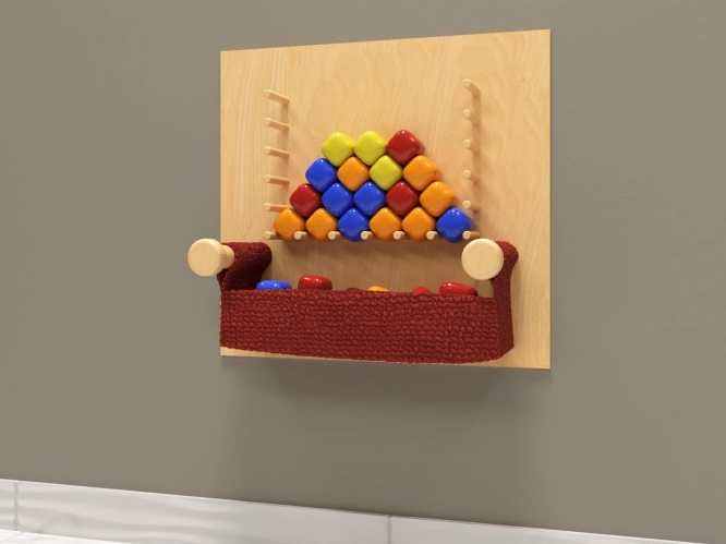 Настенная панель в виде мозаики представляет из себя компактное деревянное основание, на котором закреплены деревянные колышки, которые формируют своеобразные «бортики» поля для творчества, и корзинка, в которой хранятся элементы мозаики – маленькие разноцветные кубики. Поверхность всех игровых элементов набора обработана специальным образом, что делает панель совершенно безопасной в использовании.