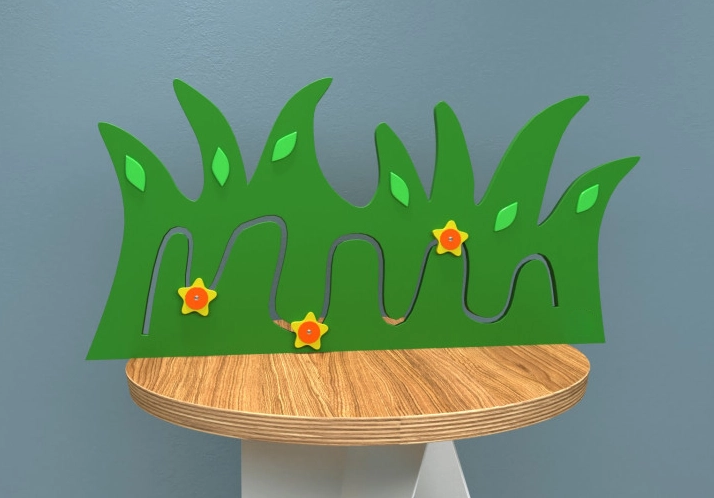 Настенная панель в виде травы привлечёт детское внимание простыми формами и яркой окраской деталей. Малыш может перемещать элементы по тактильному лабиринту по очереди или одновременно обеими руками