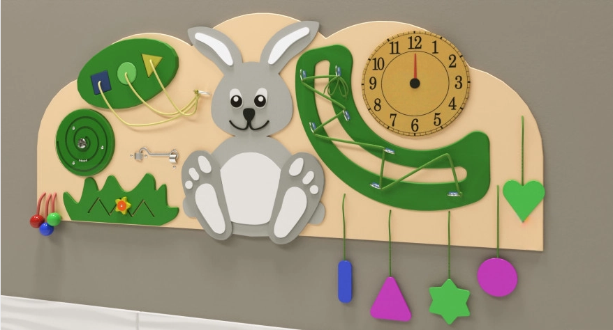Настенная панель с веселым зайцем — это ценный детский игровой модуль, ведь с его помощью можно не просто занять ребёнка, но сделать это с пользой для его развития. А ещё настенную панель легко расположить в небольшом помещении благодаря компактному исполнению, что выгодно отличает её от объёмных аналогов. Поверхность обработана специальным образом и имеет многослойное покрытие из экологически безопасных материалов.