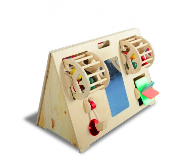 Первая реакция ребенка -это хватать все в руки, так они познают мир, сначала руки “учат” глаза. Через тактильную среду происходит изучение мира и окружающего пространства. Активное движение пальцев стимулирует зоны коры головного мозга, которые отвечают за моторику и за речь. У детей память и процесс мышление происходят практически одновременно. Ребенок сможет научиться крутить колесо и почувствует работу механизма. Формирование моторики улучшает речь у малышей и способствует скорейшему развитию. Это территория вашего ребёнка, на которой он может спокойно крутить и трогать предметы.
