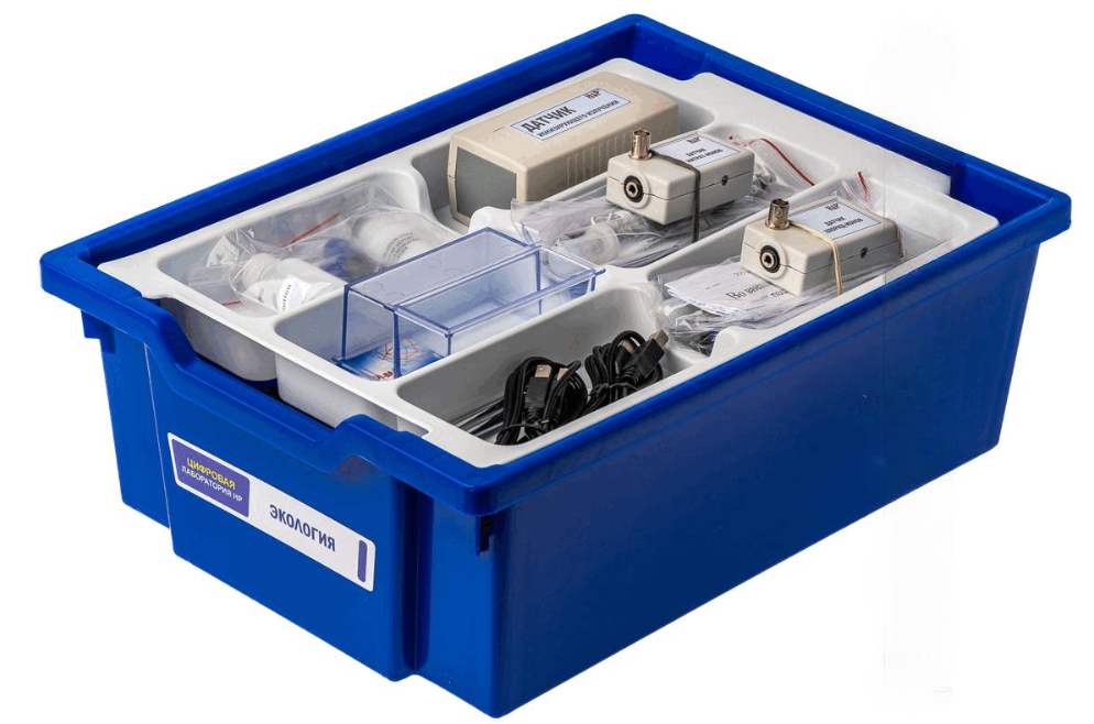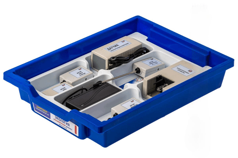 Цифровая лаборатория укомплектована в пластиковую систему хранения, которая закрывается прозрачной пластиковой крышкой на защелках для обеспечения наблюдения за содержимым. Комплект оборудования и датчики в системе хранения располагается на ложементах.