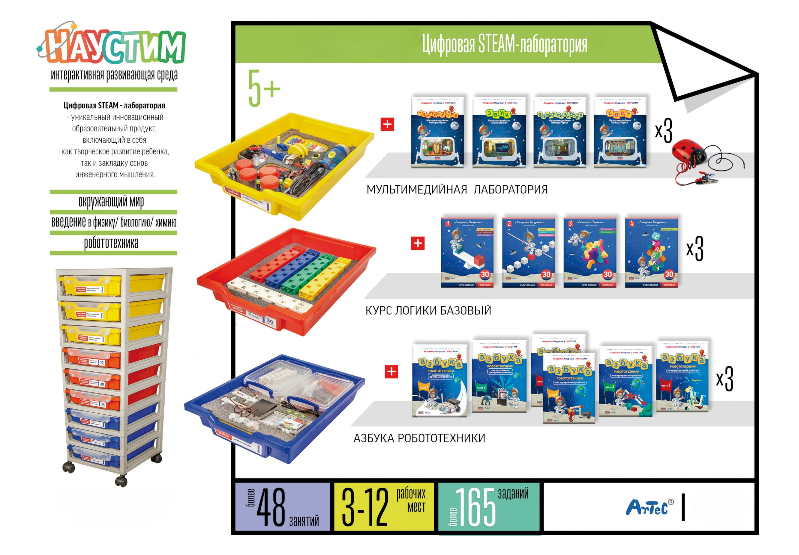 Цифровая STEAM-лаборатория — это уникальный инновационный образовательный комплекс, который включает в себя более 165 заданий (минимум 48 занятий), направленных как на творческое развитие ребенка, так и на закладку основ инженерного мышления.